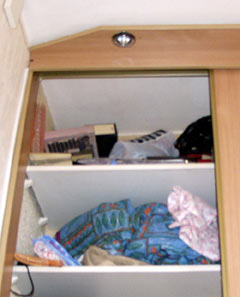 19. После окончания процесса сна постояльцы, проведшие ночь на раскладушке, обязаны произвести все действия п.18 в обратном порядке, а именно - сложить одеяло, простыню и подушку на вторую сверху полку левой части шкафа-купе (см. п 18 и фото к п.18), сложить раскладушку и отнести ее на положенное место на кухне за холодильником (см. п.17 и фото к п.17).