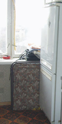 Раскладушка на своем обычном месте - на кухне, за холодильником.