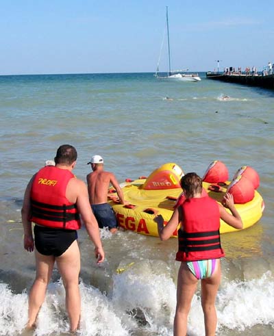 Спиной к нам, с надписью "PROFI" на спине, Женя готовится к заплыву. Глядя на фотографию, мы можем предполагать, что он собирается догонять на этой надувной лодке ту яхту, что виднеется вдали. Думаем, это должно дать хорошие результаты.