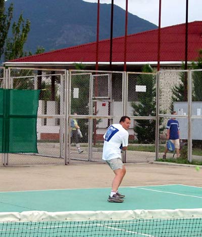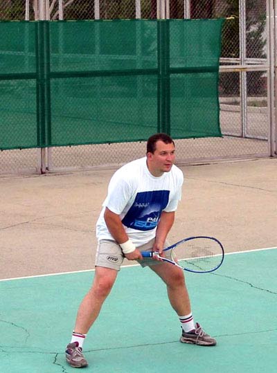 А сейчас Женя в маечке от ASUSa готовится побегать по корту, сгоняя лишние килограммы. Обратите внимание на одухотворенное лицо участника пари.