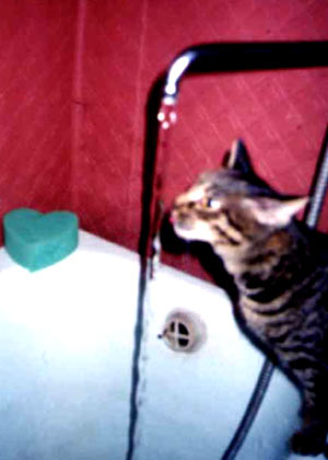Высокую философскую натуру Афони выдает и вода... Обычная водопроводная вода, которая тоненькой завораживающей струйкой течет прямо из крана. Как говорят японские мудрецы: "В мире есть только три вещи, на которые можно смотреть бесконечно: как горит свеча, как бежит вода и как начальник выдает зарплату...". Так вот, Афоня может бесконечно проводить за этим увлекательнейшим занятием свое свободное время. Причем иногда он еще пытается проверить утверждение, что в одну реку нельзя войти дважды. Поэтому нет ничего удивительного в мокрых пятнах на полу по всей квартире, когда Афоня решает наконец-то променять свое загадочное уединение на общество веселых и ласковых хозяев.