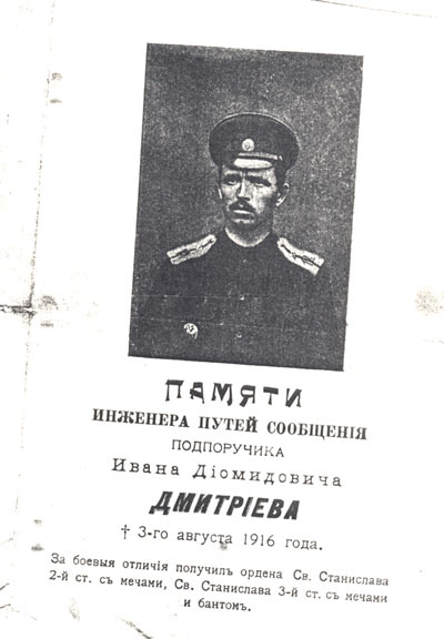 Прошу вас, прочтите о подпоручике Иване Диомидовиче Дмитриеве Приказ по 12-му железнодорожному батальону № 268 от 3 августа 1916-го года.