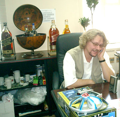 Андрей в офисе в свой день рождения с самого утра принимает поздравления по телефону. За спиной "немножко" подаренного накануне виски, на столе - управляемая летающая тарелка (подарок от ASUS`а)-))) и он же - крупно