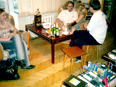 Очаровательная Юля, Андрей и компания Gigabyte в лице Олега Ложкова и Саши Дорошенко. К сожалению - еще двоих из той же компании остановил тропический ливень, обрушившийся как раз в это время на Москву! и они же - крупно